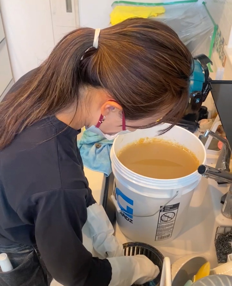 お客様宅の長年蓄積した換気扇の油汚れを、ファンを解体してしっかりと清掃させていただきます。